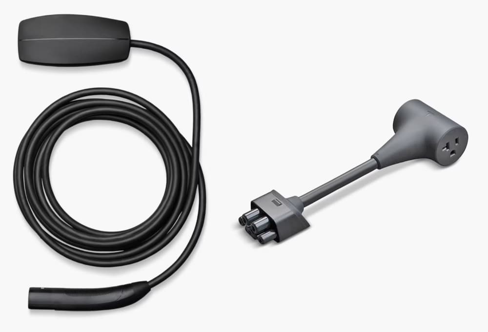 You can draw 120V/20A of power from the Tesla charge port with the combination of a Tesla Gen 3 Mobile Connector and a Tesla Outlet Adapter, both shown below.